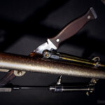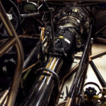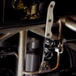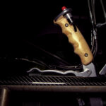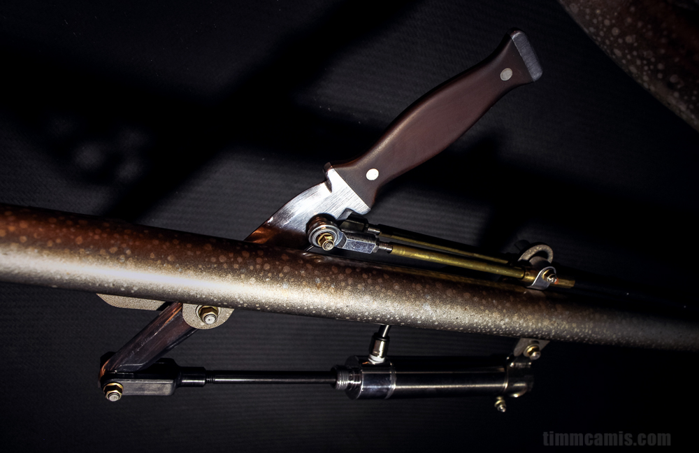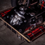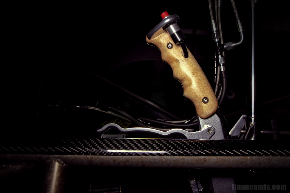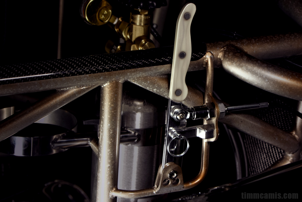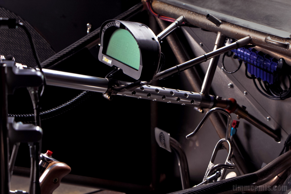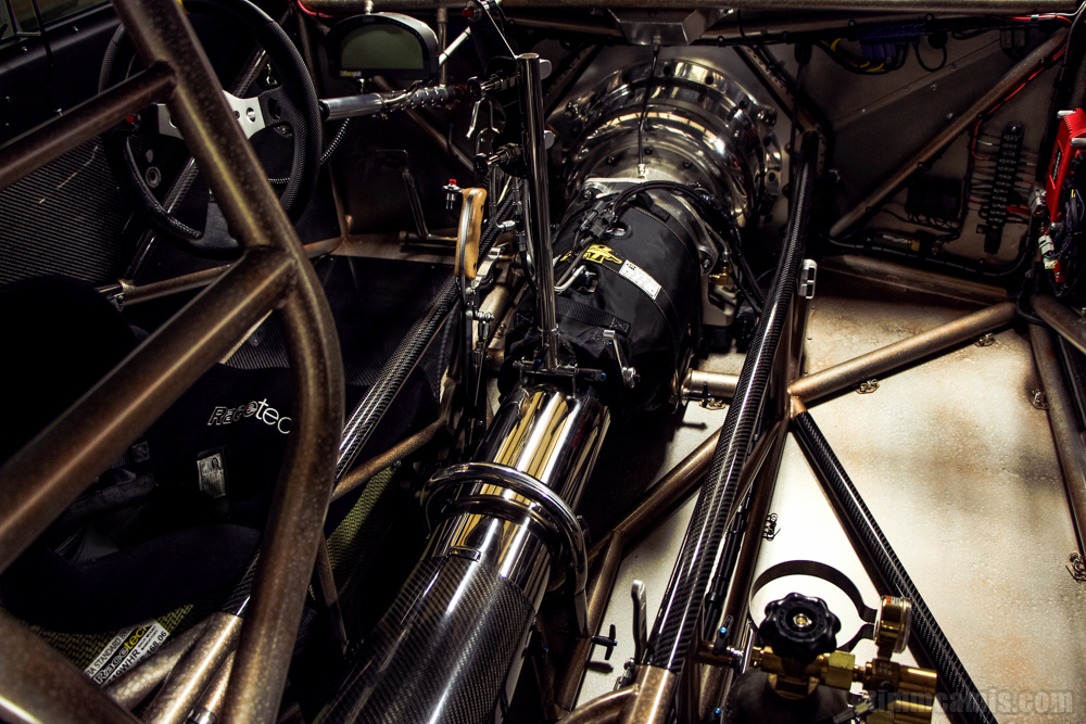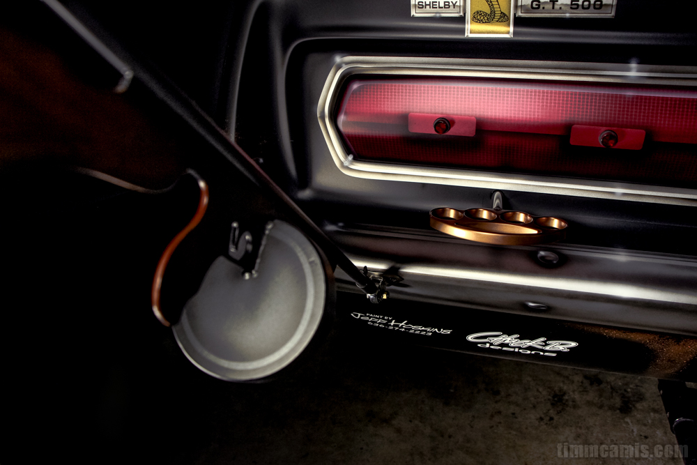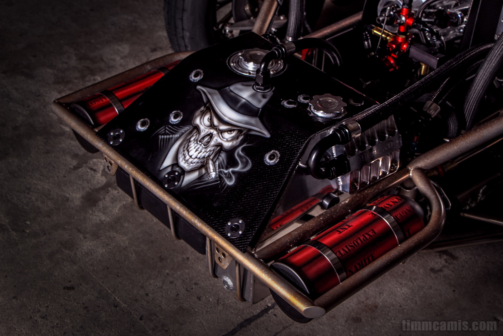 The TMRC lightweight carbon-fiber ’67 Mustang body rests atop one of their state-of-the-art Blown Pro Modified chassis, and features a custom CFH 14-71 supercharger atop a 526 cubic inch Brad Anderson HEMI engine making approximately 3,000 horsepower, while the power runs through a B&J three-speed transmission with a Quick Drive converter unit. The chassis has been powdercoated with a “rusted” look, and houses some of the trickest components known to man, including a Tim McAmis Performance Parts billet rearend housing and dozens of other custom touches. We spent nearly an hour perusing the photos and still don’t think we’ve found everything they’ve designed. The steering column has been drilled to give the appearance of a custom gun barrel, there’ss a CNC’d and airbrushed knife parachute handle, CNC brass knuckle on-off switch, dynamite-airbrushed fire bottles to go with the CNC’d/airbrushed razor fire bottle handle, and even Tommy Gun handbrake grips to complement the Tommy Gun wing struts.