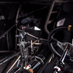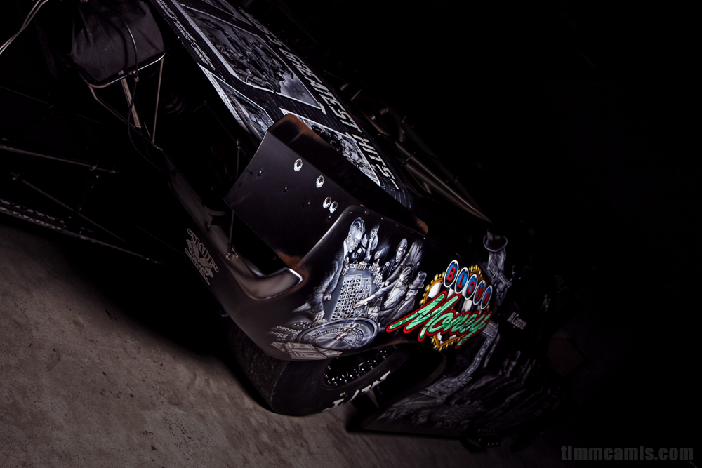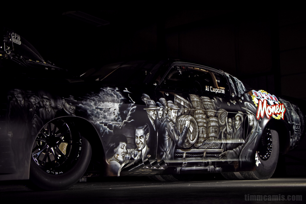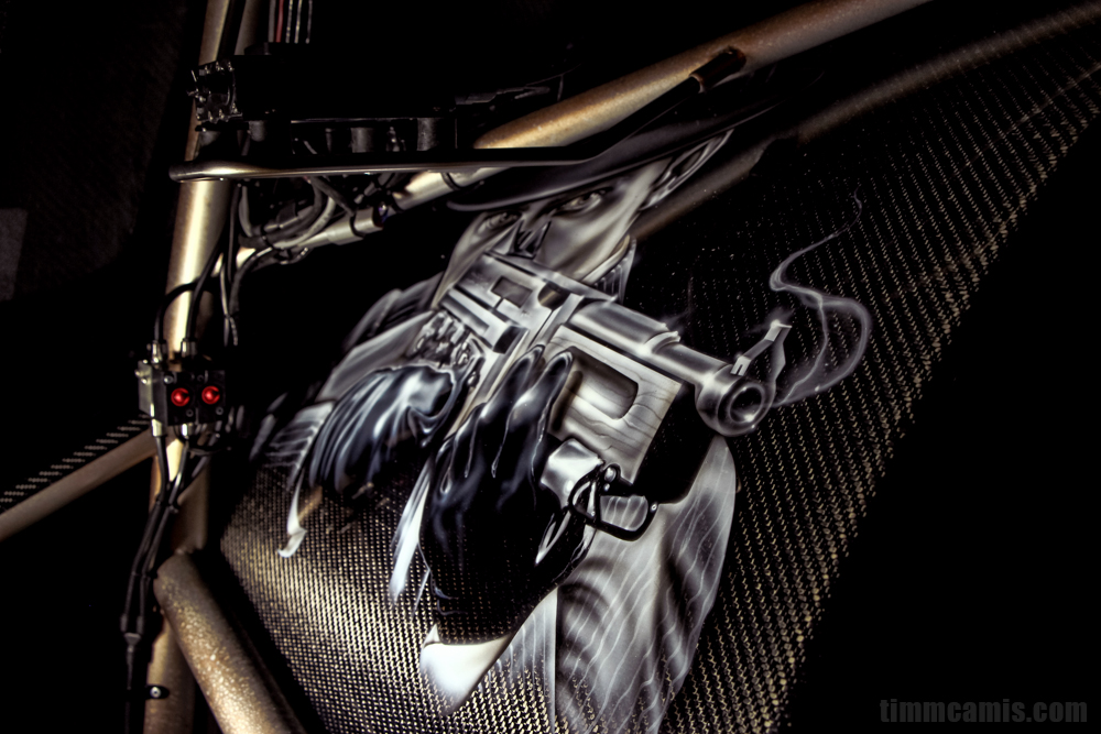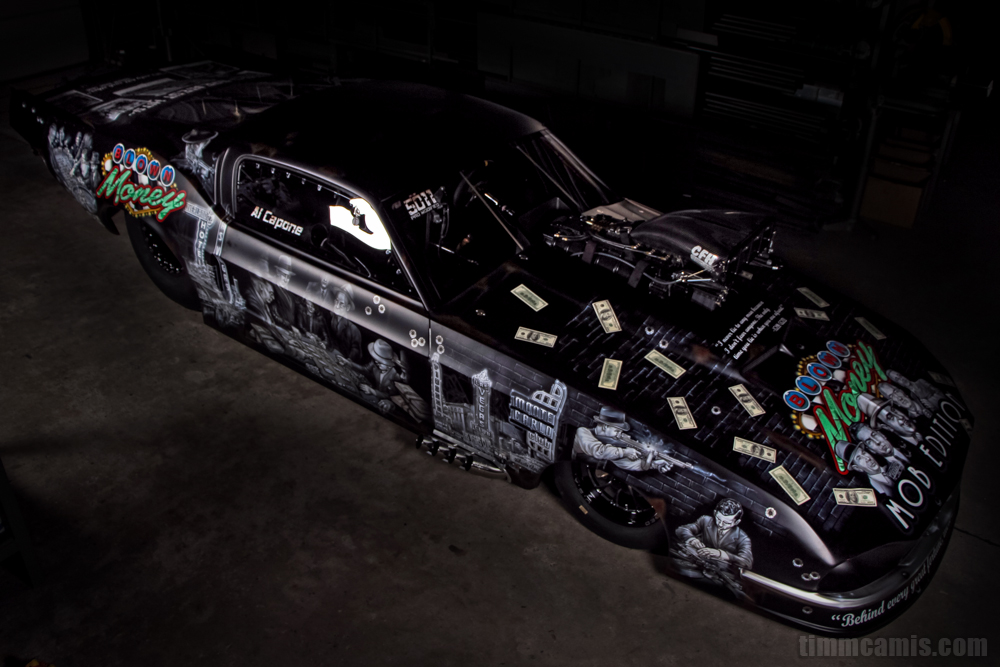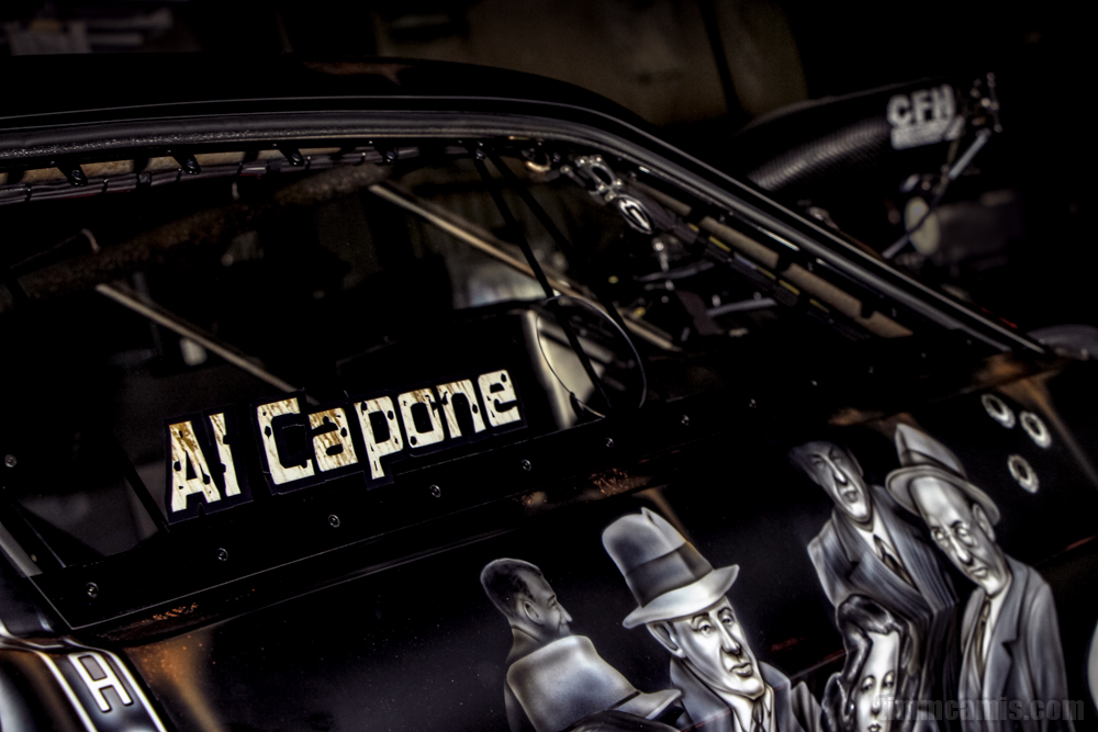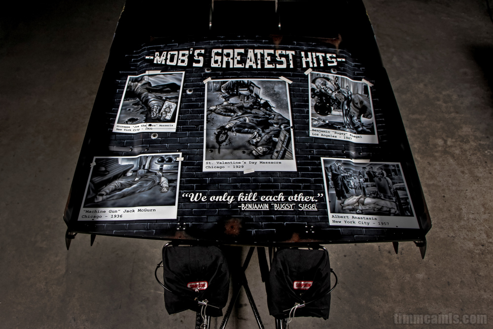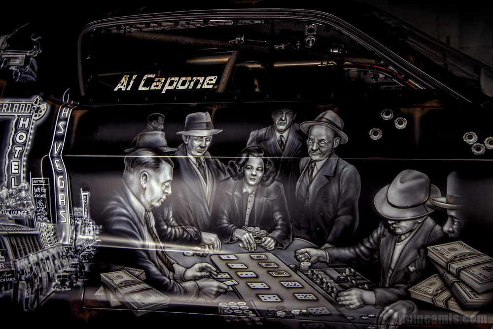 TMRC’s on-site marketing and production division, Tyrant Productions, headed by noted motorsports artist Justin Spencer, took care of the design process for Knowles. Spencer handled dozens of hours of consultation with Mike throughout the course of the build. Much time was spent researching the design, including a trip to Chicago with Mike to see the historical sites and learn all about the events and activities of the old-time Chicago Mob. This research enabled Spencer to come up with period-correct images and scenes featuring Mike’s top five mobsters – Al Capone, John Gotti, Lucky Luciano, Joe Banano, and Meyer Lansky. The driver’s side of the car depicts the Prohibition Era-mobsters, with images of Luciano, Capone, whiskey barrels, Tommy Guns, and more. On the passenger side, Mob-run “Old Vegas” takes center stage, with a historical Vegas skyline, gambling, and guns found throughout the design.