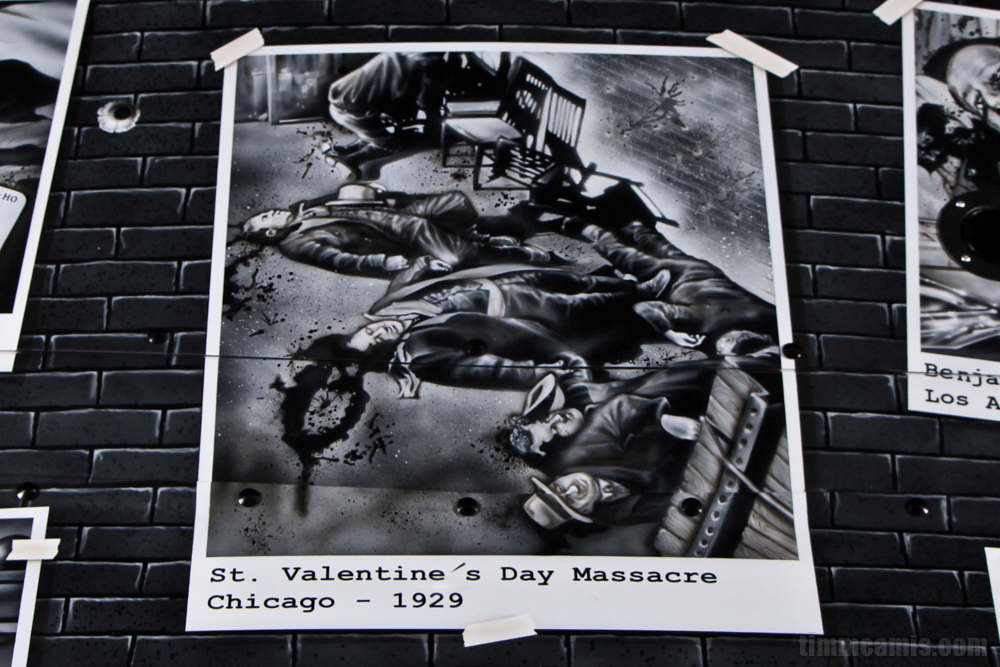 But there are more than two sides to a car – and Spencer put even more time into designing the decklid, trunk, and hood area. There, the “Mob’s Greatest Hits” depicts the St. Valentine’s Day Massacre, Joe “The Boss” Masseria, “Machine Gun” Jack McGurn, Benjamin “Bugsy” Siegel, and Albert Anastasia, sourced from newspaper photos of the day. Famous mobster quotes are also painted on all surfaces of the car, while the interior features custom airbrushed bullet holes, and there’s even a Tommy Gun shooter mural on the wheel tub.